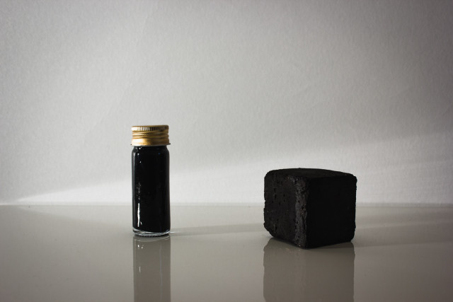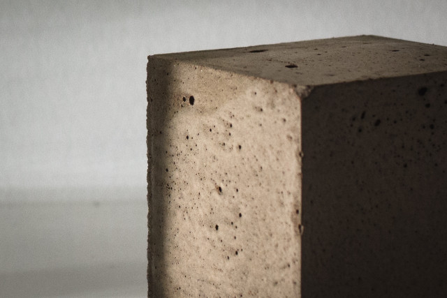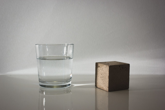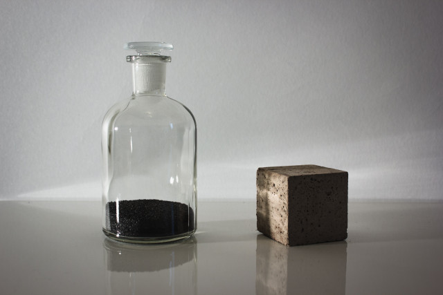 Allotropes. The same elements, organised differently. Here are the three performance works (A Working Hypothesis, Constants and Variables, and Time/Distance) rendered in sculptural form. The qualities of each concrete cube, the strength and temperament of each, is defined by the unique material used. Water binds, sand strengthens as an aggregate and ink weakens through the inclusion of carbon.