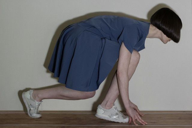 Two parallel lines of white tape create a running track that ends abruptly at a wall. Next to the wall is a speed radar. Gillian repeatedly runs towards the wall, trying to record ever-higher numbers on the display.